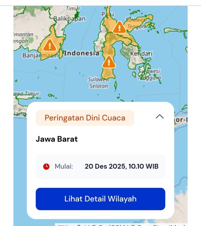 tagarutama.com, Jakarta – Badan Meteorologi, Klimatologi, dan Geofisika (BMKG) merilis peringatan dini cuaca untuk Sabtu, 20 Desember 2025. BMKG menetapkan status waspada hingga siaga di sejumlah wilayah Indonesia menyusul potensi hujan sedang hingga sangat lebat yang dapat meningkatkan risiko bencana hidrometeorologi.